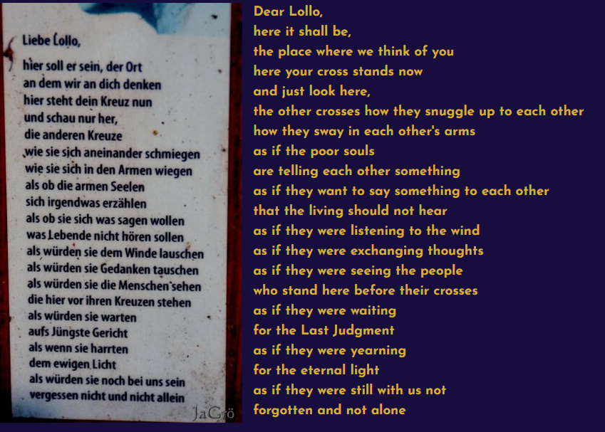 The grave crosses are set up by the bereaved. Why? We could not clarify this satisfactorily either. However, there is a comparison to the Hill of Crosses in Lithuania, where stories of healings are told when crosses are placed there. However, those are exclusively for the living so that they may become healthy again—and supposedly, they were.