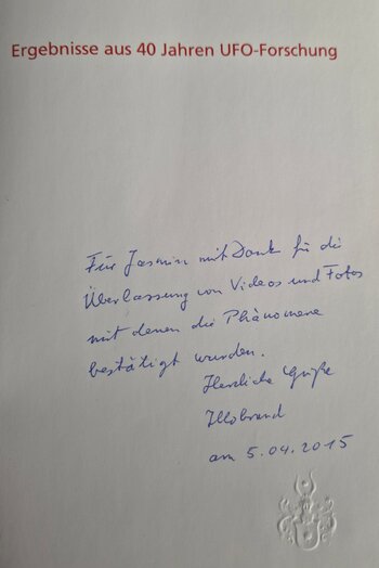 ◆ Personal Scientific Recognition ◆ Handwritten confirmation by Illobrand von Ludwiger In the specialist books in which my UFO recordings were published, the astrophysicist Illobrand von Ludwiger personally confirmed to me in writing that these phenomena were proven through my photos and my special talent. This dedication proves my technical expertise and the real confirmation of my work by fringe science