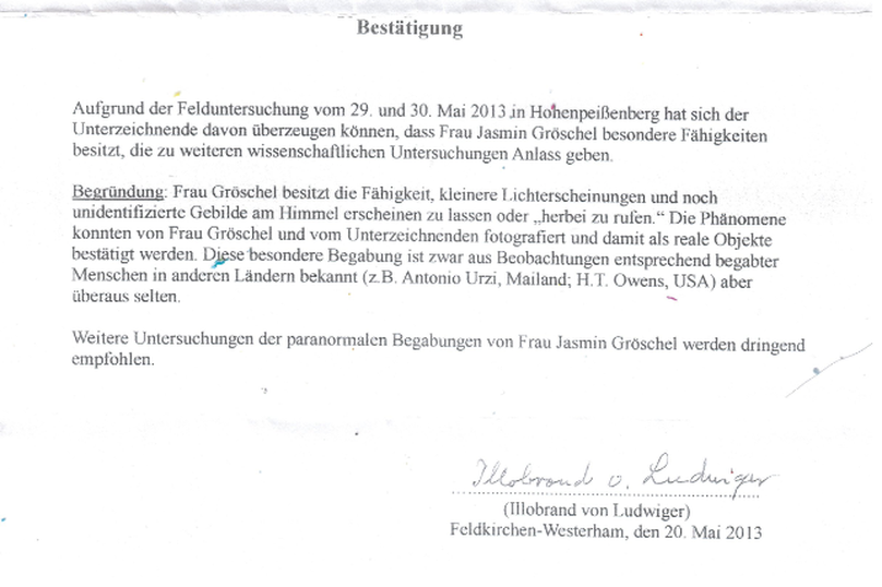 Based on the field investigation conducted on May 29th and 30th, 2013, in Hohenpeißenberg, the undersigned has been convinced that Ms. Jasmin Gröschel possesses special abilities that warrant further scientific investigation.